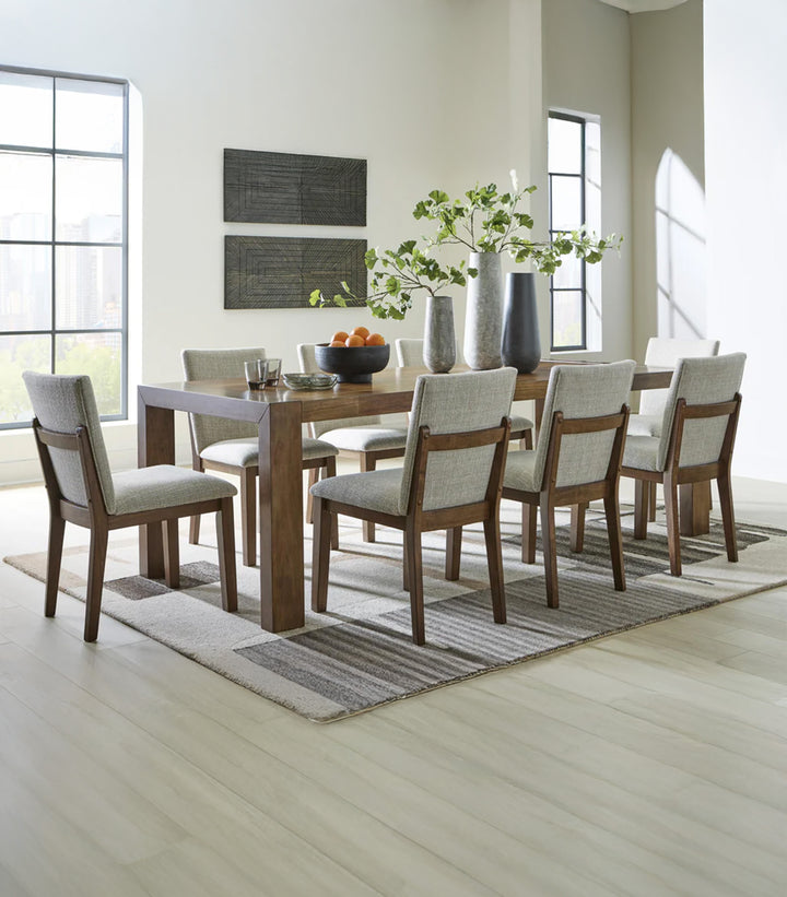 Diseño contemporáneo para 8 personas – Ideal para familias grandes o quienes aman recibir visitas, con una mesa rectangular amplia y 8 sillas cómodas sin brazo que optimizan el espacio.