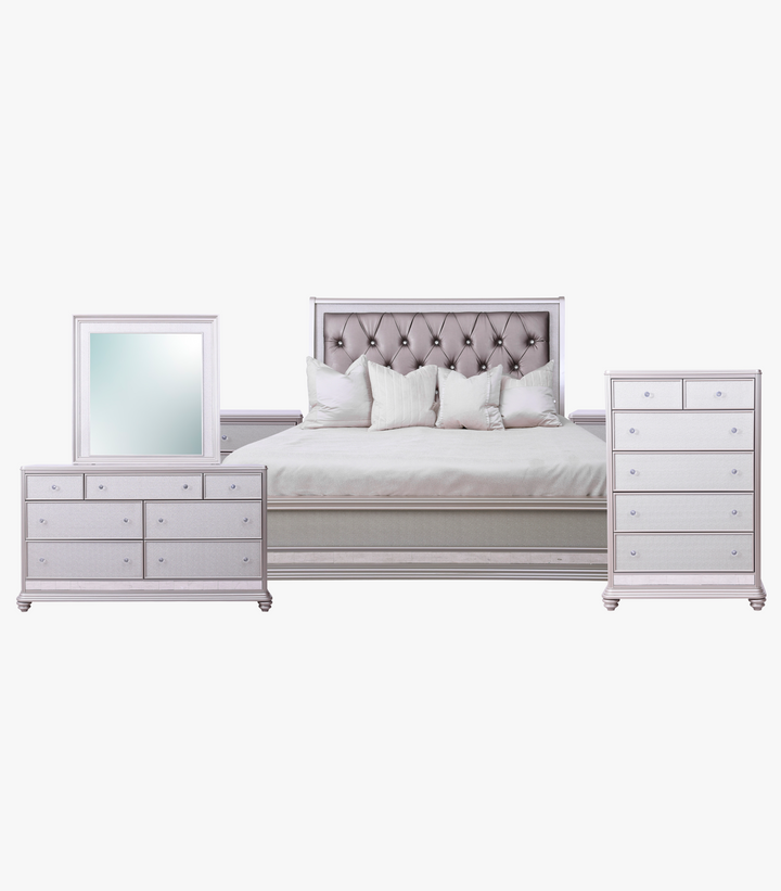 Recámara King Size Sheridan de madera color plata - Incluye buró, cajonera, vanity con espejo.